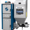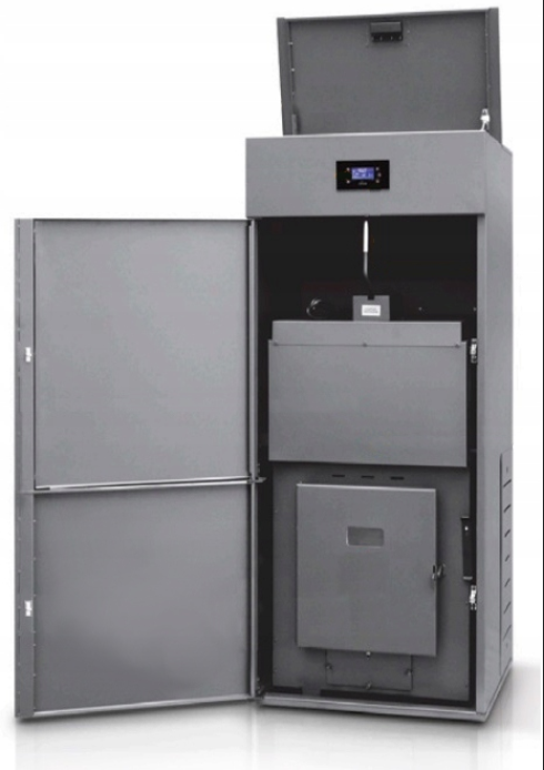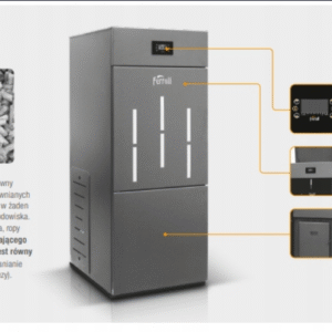 Ekologiczny kocioł stalowy opalany peletem z pojemnym zbiornikiem na pelet.