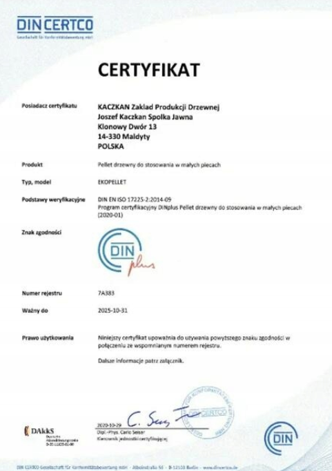 CERTYFIKAT DIN PLUS -potwierdza najwyższą jakość pelletu!!!